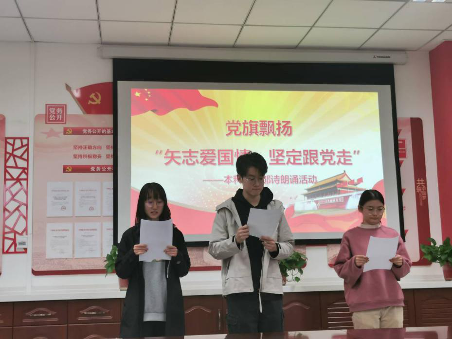 此次活动各党员积极参与,以单人朗诵或组队的形式表达了对祖国热忱的爱、对党的忠诚与歌颂。“我是你的十亿分之一,是你九百六十万平方的总和;你以伤痕累累的乳房喂养了迷惘的我、深思的我、 沸腾的我……”支部成员怀着赤子的深情朗诵了《祖国啊,我的祖国》,祖国与我、我与祖国相互交融,我们用自己的身躯与心灵献身祖国的奔跑与腾飞。